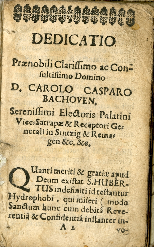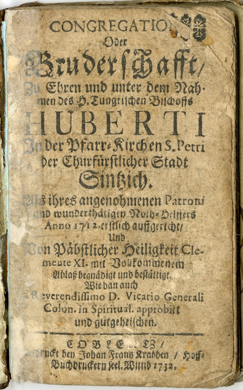 Später übernahm der Sohn und Nachfolger von Johann Bertram, Carl Caspar Bachofen von Echt, das Protektorat der Bruderschaft, wie in einem Andachtsbuch von 1732 nachzulesen ist. Die Ursprünge der Hubertus-Verehrung im Herzogtum Jülisch-Berg liegen in der Gründung des Hubertus Ritterordens, der am 3. November 1444, dem Hubertus-Tag, nach der siegreichen Schlacht bei Linnich gegen den Herzog von Geldern durch unseren Landesherrn Herzog Gerhard II. gestiftet wurde.